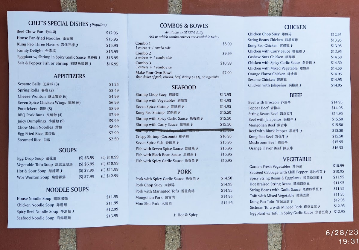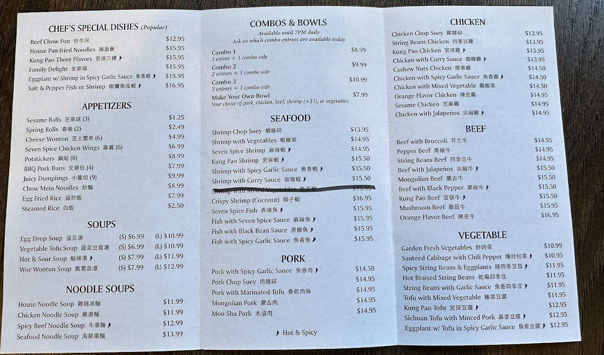 Seven Spice Kitchen offers a diverse and flavorful menu that caters to a variety of tastes, with dishes that range from comforting noodle soups to flavorful chef’s specials and seafood options. For noodle soup lovers, the House Noodle Soup (雜錦湯麵), Seafood Noodle Soup (海鮮湯麵), and Spicy Beef Noodle Soup (牛湯麵) are standouts, offering rich broths with satisfying ingredients. If you’re craving something with a little more heat, the Spicy Beef Noodle Soup and Chicken Noodle Soup (雞湯麵) offer a perfect balance of spice and flavor.